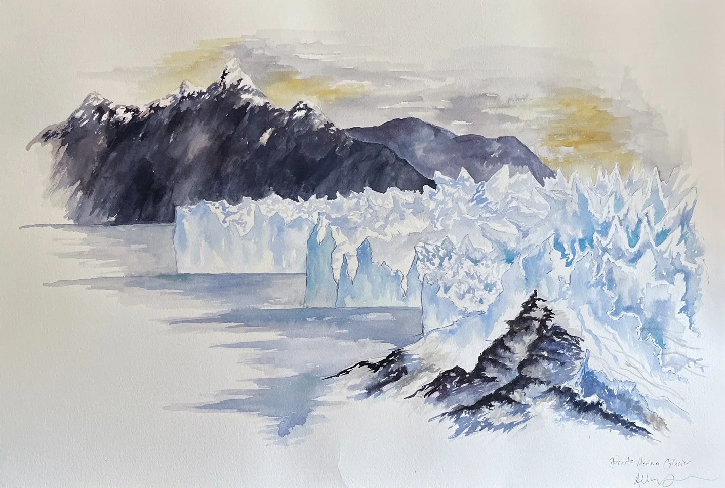 An absolute must see in this region of Argentina. Located just an hour from the desert and high plateaus, you drive into the low mountain range and the mountains break open to view this immense glacier marching into the water. This painting is just a small section of this massive river of ice. It is truly only an impression of it, but the colors are accurate with the mixture of intense teal blue of the ice, the minerally pale blue of the water and the dark rocks of the earth below and above.