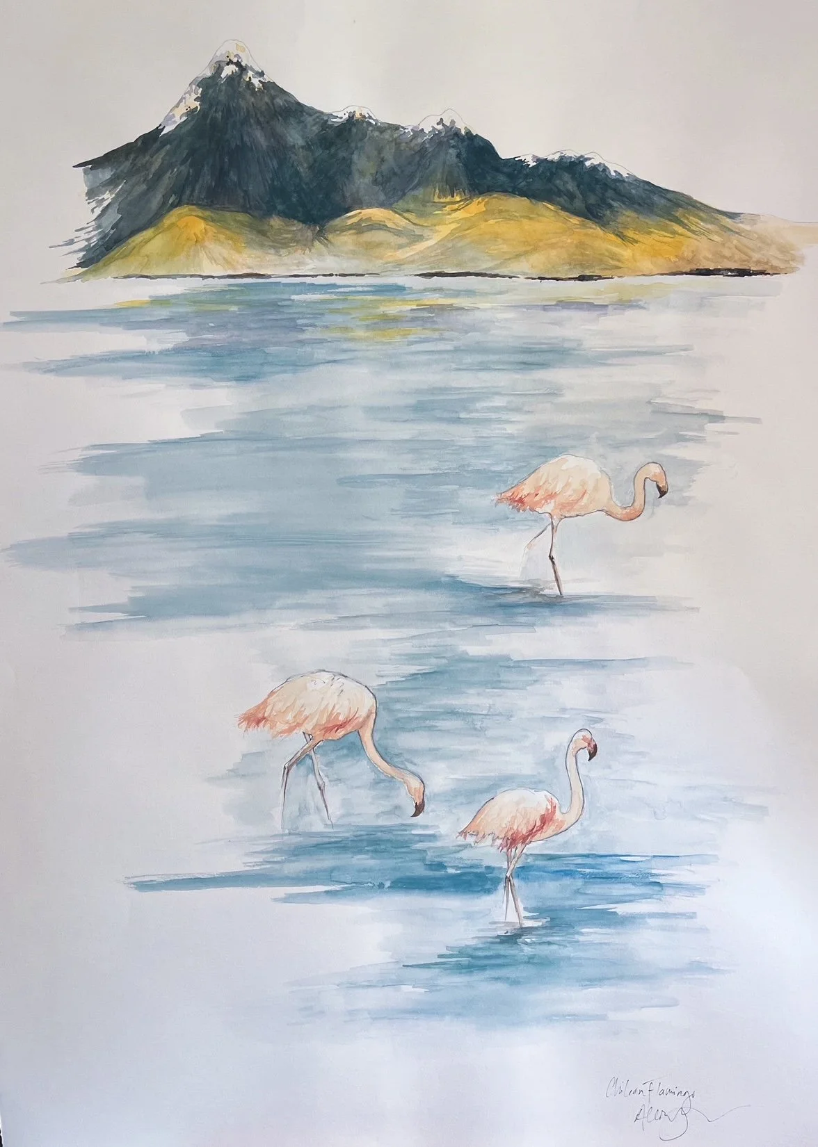 One of the most striking aspects of this landscape is the high plateau deserts flowing into the mountains. Even more so are the flamingos that gather and graze in these arid lakes. I found the scene strikingly beautiful and wanted to capture the strangeness of it all together.